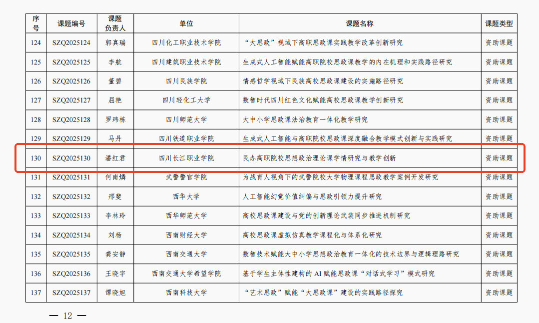 【本网消息】(教务处 钟婷婷)近日,四川省教育厅正式公布《2025年四川省思想政治教育研究课题(思想政治理论课青年教师专项)立项名单》(川教函〔2025〕322号)。我校马克思主义学院潘红君老师申报的《民办高职院校思想政治理论课学情研究与教学创新》项目,成功获批思想政治理论课青年教师专项资助课题。