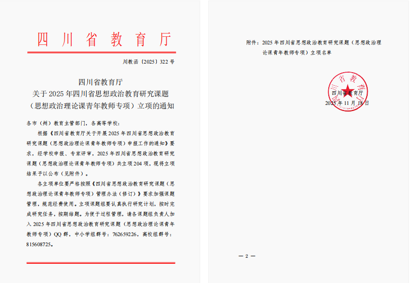 据悉,2025年度四川省思想政治教育研究课题经组织申报、专家评审等环节,最终在思想政治理论课青年教师专项中立项200项。该专项涵盖中小学及高校多个教研群体,立项竞争激烈。近年来,我校在该专项中已累计立项7项,展现出青年教师在思想政治理论课研究方面的持续活力。